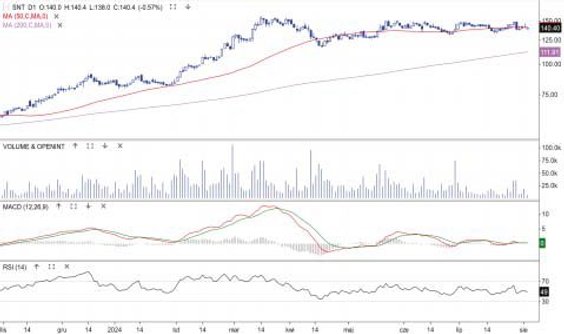 Gigant pokazał w minionym tygodniu szacunkowe wyniki za I półrocze, które wypadły lekko poniżej oczekiwań. To wpisało się w trwającą od maja powolną wyprzedaż walorów. Budimex porusza się w rytm WIG20, ale na jego wykresie krótkoterminowy trend spadkowy ma bardziej książkowy przebieg (wyraźnie niższe szczyty i dołki). W ostatnich dniach cena przebiła średnią z 200 sesji, czyli umowną granicę hossy. Nie zdarzyło się to od czerwca 2022 r., więc na pewno nie można bagatelizować tego ostrzeżenia. Oscylator MACD jest już bardzo nisko, co daje szanse na próbę powrotu nad granicę.