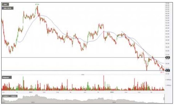 Jastrzębska Spółka Węglowa osunęła się od początku roku o 40 proc. po 28-proc. przecenie w ubiegłym roku. W ostatnich dniach kurs broni się przed spadkiem na poziomie 25 zł. Przy tym pułapie kurs był także w czerwcu tego roku, ale w dłuższym terminie poziom ten nie odgrywał poważniejszej roli. Wyhamowanie przy 25 zł może więc okazać się tylko przystankiem przed dalszą przeceną węglowego przedsiębiorstwa. W razie obrony i zmiany trendu w średnim terminie pierwszym poważnym oporem będą okolice 30 zł.paan
