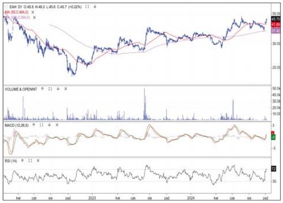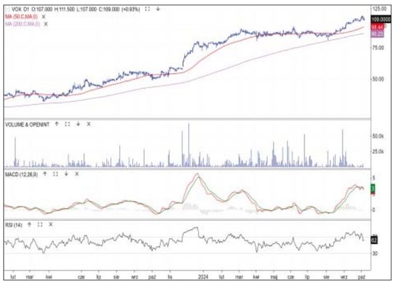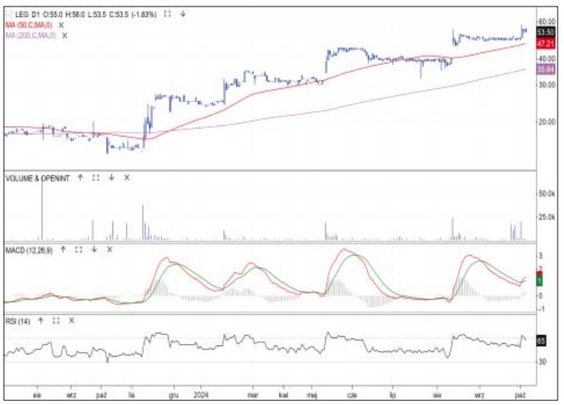 To najlepszy drugi kwartał w historii firmy. W czwartek spółka poinformowała też o planach zwiększania przychodów i marży na sprzedaży, a także o ekspansji zagranicznej i nowym modelu franczyzy. Kurs w porywach rósł do 46 zł, a jeszcze tydzień wcześniej testował średnią z 200 sesji przy 37 zł. Najbliższym celem notowań jest okrągłe 50 zł.