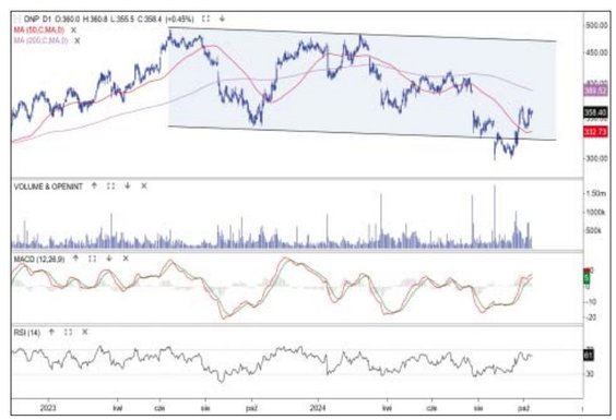 W ubiegły poniedziałek kurs akcji właściciela sieci sklepów zawrócił nad średnią z 50 sesji i wrócił nad 350 zł. Część komentatorów wiązała ten wzrost z nowelizacją ustawy o wychowaniu w trzeźwości i zakazem sprzedaży alkoholu na stacjach benzynowych. Od strony technicznej ruch wpisuje się w szeroki spadkowy kanał, który budowany jest na wykresie od ponad roku. Rynek próbuje zawrócić ze strefy wyprzedania. Potencjalny cel to średnia z 200 sesji i okrągłe 400 zł. Przebicie tych oporów może otworzyć drogę na wyższe poziomy w ramach kanału. Średnia z 50 sesji pozostaje wsparciem.