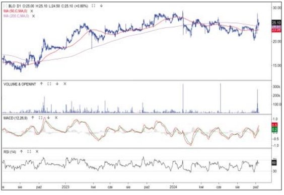 Kurs akcji producenta gier wzrósł w ubiegły poniedziałek o 14 proc., do 26 zł, choć w porywach cena sięgała 28 zł. Notowania, przy wyraźnie podwyższonym obrocie, pokonały za jednym zamachem całą rozpiętość średnioterminowej konsolidacji. Powód? Gracze bardzo wysoko oceniali nową produkcję studia – „Silent Hill 2”. Na Steamie odsetek ocen pozytywnych sięgał w piątek 92,3 proc., a maksimum liczby grających wynosiło 23 676. Wzrosły więc techniczne szanse na wyjście górą z konsolidacji i kontynuację trendu wzrostowego. Najbliższe wsparcie wyznacza strefa między średnimi z 50 i 200 sesji (24–23 zł).
