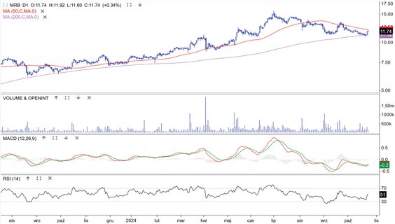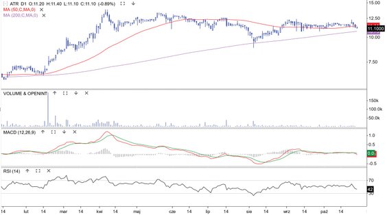 Spółka z Grupy Immobile pokazała w minionym tygodniu szacunkowe wyniki finansowe. Po trzech kwartałach przychody wyniosły 122,6 mln zł, czyli 32 proc. więcej niż rok temu. Na koniec września portfel zamówień był wart 445,2 mln zł. Rynek zareagował na te dane 3-proc. odejściem kursu w górę od średniej z 50 sesji, ale na kolejnych sesjach zszedł on ponownie do tego wsparcia. Średnioterminowo cena pozostaje w konsolidacji, a długoterminowo – w hossie. Granica tej ostatniej znajduje się już blisko kursu, co od strony technicznej może aktywować popyt. Układ najbliższych wsparć i oporu wyznaczają zatem wspomniane średnie.