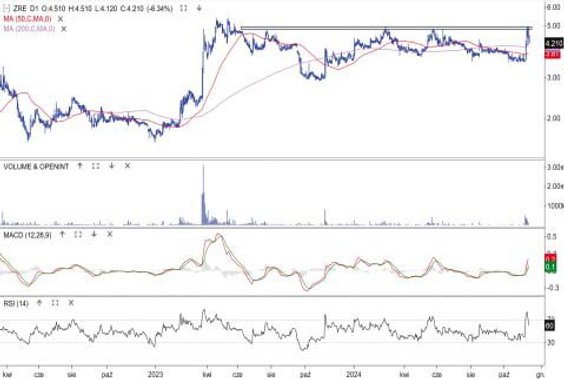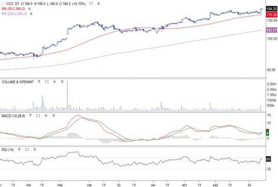 Kurs akcji spółki zajmującej się przetwórstwem odpadów zyskał w czwartek 15,1 proc. i przy podwyższonym obrocie przebił średnie kroczące z 50 i 200 sesji. Za jednym zamachem odrobione zostały całe październikowe straty. Notowania napędzał raport wynikowy. Spółka osiągnęła w trzecim kwartale 80 mln zł przychodów, podczas gdy rok temu to było 57,5 mln zł. Sytuacja na wykresie kursu jest bardzo ciekawa. Cena akcji porusza się bowiem w długoterminowej konsolidacji i właśnie dotarła do pierwszego ważnego oporu 330 zł. Jeśli go przebije, może ruszyć na długoterminowy szczyt, czyli górną granicę wahań przy 350 zł.