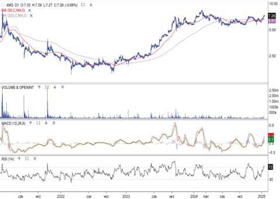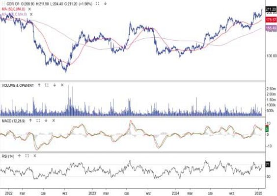 Kurs akcji producenta gier wzrósł w czwartek o 6,5 proc., przebił opór 200 zł, a w piątek rano wyznaczył nowy szczyt trwającego trendu 212,8 zł. Po południu kurs sięgał nawet 217,5 zł. Notowania napędzał komunikat o nowej polityce dywidendowej, która zakłada, że 25 proc. rocznego zysku będzie przeznaczane na wypłatę akcjonariuszom. Zasady te będą obowiązywać, począwszy od podziału zysku za 2025 r. Od strony technicznej cena rozpoczęła nową falę zwyżek. Jej potencjalny zasięg, szacowany na podstawie długoterminowych oporów, to okolica 240 zł. Wsparciem pozostaje strefa cenowa między średnimi z 50 i 200 sesji (obecnie 178–156 zł).