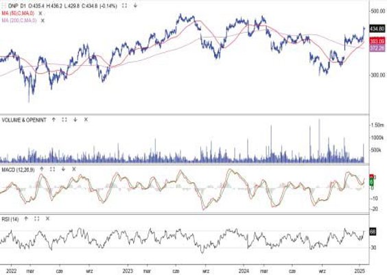 Właściciel sieci sklepów Dino ma za sobą udany tydzień. Kurs akcji zawrócił nad średnią z 50 sesji i przełamał opór 420 zł. Jednocześnie na MACD pojawił się cykliczny sygnał zwrotu, a w grudniu wspomniana średnia przebiła w górę swoją 200-sesyjną odpowiedniczkę, tworząc formację złotego krzyża. W ostatnich dniach byki były napędzane przez wyniki konkurencyjnej sieci Jeronimo Martins. Ponadto sam raport Dino za III kwartał był pozytywnym zaskoczeniem i zwiększył apetyty inwestorów przed kolejnym sezonem wynikowym. Pułap 420 zł jest teraz wsparciem. Jeśli uda się go utrzymać, następnym celem będzie już rekord historyczny, czyli 491,8 zł.