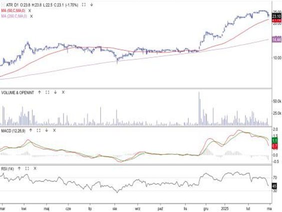 Rynek zareagował spadkiem notowań o 14,7 proc., a rykoszetem dostał Atrem, w którym GKI ma prawie 72 proc. udziału. Kurs jest w fazie korekty hossy i zbliża się do średniej kroczącej z 50 sesji. Jeśli wsparcie pęknie, kurs może zejść w rejon 200-sesyjnej średniej, która obecnie przebiega przy 14,4 zł. Oporem pozostaje szczyt trendu, czyli poziom 25,9 zł.