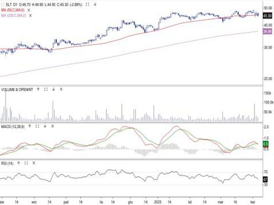Kurs akcji wykonawcy instalacji elektrycznych dość nerwowo zareagował na opublikowane w środę wyniki roczne. Cena spadła o 4 proc., choć spółka zarobiła na czysto 54,1 mln zł, wobec 22,4 mln w 2023 r. Ponadto zarząd zarekomendował dywidendę 2,5 zł na akcję. Mimo spadku notowania utrzymały się powyżej średniej 50-sesyjnej. I co więcej, również w drugiej połowie tygodnia, mimo fali podaży, która objęła większość GPW, Elektrotim utrzymał ruchome wsparcie. Ta relatywna siła i odporność na wojnę celną to pozytywne sygnały dające szanse na kontynuację hossy. Strefa między średnimi z 50 i 200 sesji stanowi najbliższe wsparcie.