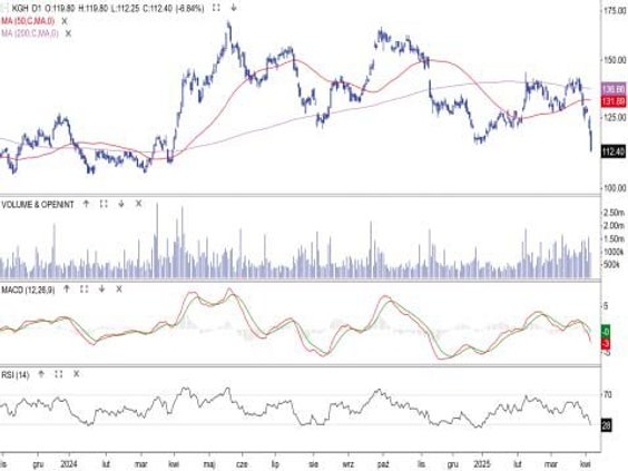 Dwa tygodnie temu notowania miedziowego giganta po raz drugi w tym roku nie zdołały przebić się przez średnią z 200 sesji. W konsekwencji cena zeszła na niższe poziomy, przełamując średnią z 50 sesji, dołek oddzielający ostatnie dwa lokalne szczyty i grudniowe minimum. W ostatnich dniach KGHM należał do ścisłego grona najsłabszych blue chips. Nie sprzyjała mu taniejąca miedź, której zachowanie odzwierciedlało obawy, że wojna celna wpędzi globalną gospodarkę w recesję. Dla lubińskiej spółki najbliższe wsparcie to okolica okrągłych 100 zł. Oporem jest strefa 125–115 zł.