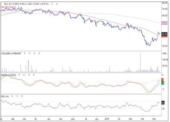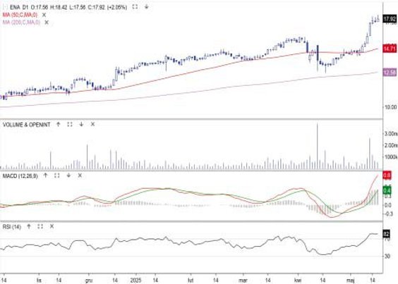 Przedstawiciel branży energetycznej, podobnie jak cała branża, radzi sobie w tym roku bardo dobrze. Wycena akcji wzrosła w pięć i pół miesiąca o 40 proc. W minionym tygodniu notowania wyznaczyły nowy szczyt hossy 18,42 zł. Zwyżki wspierały m.in. komunikaty o powrocie do wypłacania dywidendy, a także zapowiedź przez MAP miliardowych inwestycji w sektor energetyczny. Oscylatory MACD i RSI sygnalizują krótkoterminowe wykupienie, co może zwiastować korektę. Najbliższe wsparcia są w strefie 16–15 zł. Oporem i potencjalnym celem jest natomiast szczyt historyczny 22,15 zł.
