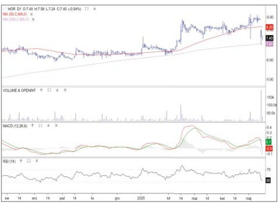 Notowana na NewConnect spółka z branży ogrodniczej pokazała w minionym tygodniu wyniki za I kwartał, które rozczarowały inwestorów. Przychody wprawdzie wzrosły rok do roku o 4,6 proc., do blisko 60 mln zł, ale zysk netto był o 12,5 proc. niższy i wyniósł nieco ponad 7 mln zł. W efekcie kurs akcji spadł w czwartek aż o 15,5 proc., naruszając 7 zł, gdzie przebiega średnia z 200 sesji. Pytanie, czy rynek nie przereagował? Obrona wspomnianej średniej (umowna granica hossy) zwiększy szanse na odbicie i powrót do trendu. Przełamanie natomiast będzie grozić zmianą głównej tendencji.