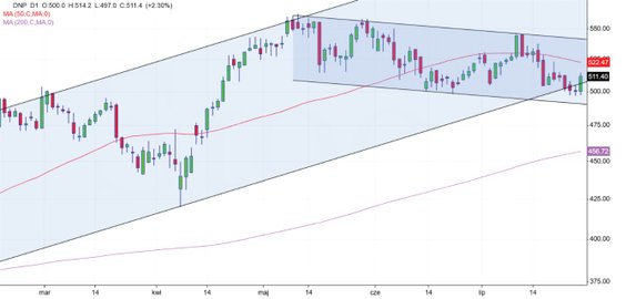 Na wykresie tygodniowym kurs Dino Polska wciąż broni wsparcia na 500 zł, ale w krótszym horyzoncie sytuacja komplikuje się. Kurs handlowej spółki porusza się poniżej średniej pięćdziesięciosesyjnej, a do tego ostatnie dni przyniosły wybicie z kanału wzrostowego, zapoczątkowanego przed rokiem. W krótszym okresie notowania Dino osuwają się wzdłuż kanału spadkowego, od szczytu wyznaczonego w pierwszej połowie maja. W razie kontynuacji spadków wsparciem mogą być okolice 442 zł, gdzie rysuje się 38,2-proc. zniesienie wspomnianej fali wzrostowej. Negatywny scenariusz wymazałby się po wybiciu ponad 540 zł, co otworzyłoby drogę na szczyt.