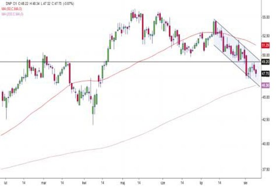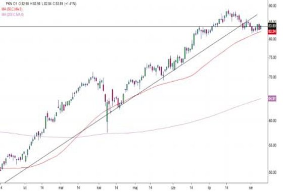 Orlen to jeden z motorów napędowych tegorocznych zwyżek na warszawskiej giełdzie. Trend wzrostowy jest tu silny. Orlen jest jednak jedną ze spółek, która odstaje ostatnio od rynkowego tempa. Od szczytu z połowy lipca firma przeceniła się już o około 7 proc. Przełom lipca i sierpnia przyniósł wybicie kursu pod linię trendu spadkowego. Jak na razie nie doszło do katastrofy, ale kurs poddaje się krótkoterminowej linii spadkowej. Pierwsze mocne wsparcie po tak dynamicznych zwyżkach wypada w okolicach 75 zł, czyli na 38,2-proc. zniesieniu fali wzrostowej od kwietnia.