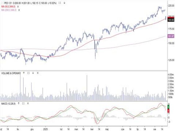 W czwartek po sesji Ministerstwo Finansów zaproponowało podwyżkę CIT-u dla banków z obecnych 19 proc. do 30 proc. w 2026 r., a następnie obniżkę do 26 proc. w 2027 r. i wprowadzenie stałej stawki 23 proc. od 2028 r. Informacja ta wywołała wyprzedaż akcji sektora bankowego na ostatniej sesji tygodnia. Pekao był najsłabszym podmiotem w całej branży.