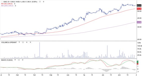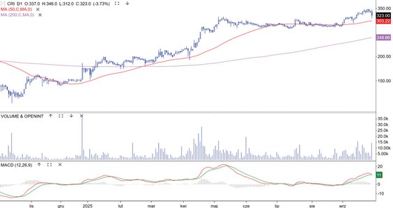 W połowie września kurs akcji kosmicznej spółki przebił 320 zł i wybił się górą z trwającej od maja konsolidacji. Cena rozpoczęła kolejną falę wzrostową w obrębie trwającej hossy. W piątek spółka podała wyniki półroczne – przychody wyniosły 67,9 mln zł wobec 11,8 mln zł rok temu, a zysk netto wyniósł 3,5 mln zł wobec straty sprzed roku sięgającej 7,5 mln zł. Raport został przez inwestorów przyjęty nerwowo.