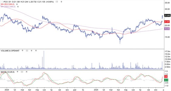 Akcje właściciela sieci sklepów podrożały w czwartek o 13,8 proc., a w piątek rano cena dotarła do 25,8 zł, czyli poziomu najwyższego od stycznia 2024 r. Rynek zareagował tak na wstępne wyniki za trwający rok obrotowy. Przychody, z wyłączeniem sieci Poundland, mają przekroczyć 4,5 mld euro. Zysk netto po 9 miesiącach wyniósł natomiast 196 mln euro, a za cały poprzedni rok to było 199 mln zł. Spółka ogłosiła też drugi etap programu skupu akcji o wartości 50 mln euro i wezwała do wykupu obligacji o wartości 175 mln euro. Cena kontynuuje ruch w obrębie tegorocznego kanału i weszła w strefę oporową 25–27 zł. Najbliższe wsparcie wyznacza czwartkowa luka.