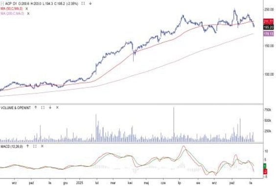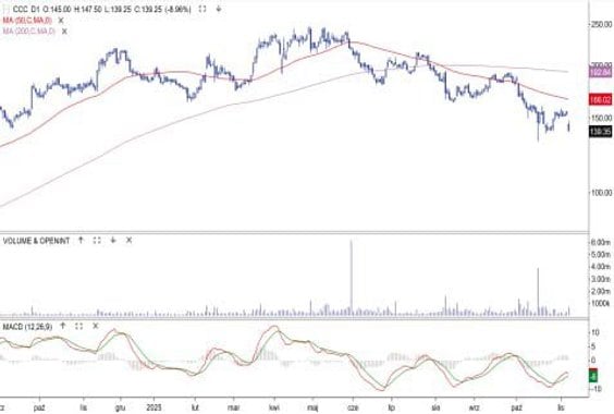 W piątek rano obuwnicza spółka pokazała szacunkowe wyniki za III kwartał. Były one niższe od oczekiwań. Inwestorzy zareagowali sprzedażą akcji. Kurs w porywach, po południu, sięgał 140 zł. Cena zbliżyła się do strefy wsparcia 137,35 – 131,55 zł, wyznaczonej przez dwa ostatnie, lokalne dołki. Jej przebicie będzie sygnałem kontynuacji układu spadkowego, budowanego od sześciu miesięcy.