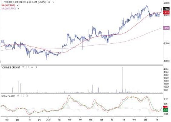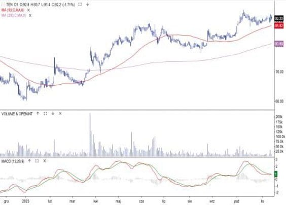 W środę po sesji producent gier pokazał wyniki za III kwartał. Przychody wyniosły 90,4 mln zł i były o 7 proc. lepsze od oczekiwań. Ponadto podczas wideokonferencji prezes spółki poinformował, że ma ona prototyp nowej gry i że zostanie on niebawem udostępniony. Cena akcji zareagowała wzrostem i naruszyła 94 zł. Do szczytu budowanego od początku roku układu wzrostowego brakuje tylko 2,4 zł. Pułap 96,4 zł to silny, długoterminowy opór. Jego przebicie będzie potwierdzeniem siły popytu i otworzy drogę na wyższe poziomy. Byki wspiera cykliczny zwrot na MACD. Najbliższe wsparcie to 89 zł.