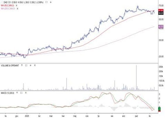 Gorsze od oczekiwań raporty CCC i Dino popsuły nastawienie do spółek detalicznych. To udzieliło się także Pepco. Kurs akcji po raz drugi w ostatnim czasie zawrócił spod oporu 29 zł. W efekcie na wykresie zarysowuje się potencjalna formacja podwójnego szczytu z linią sygnalną na poziomie dołka 27 zł. Jest to krótkoterminowy układ o rozpiętości 2 zł. Stąd potencjalny zasięg spadku po przełamaniu wspomnianej linii to 25 zł. Tam znajduje się obecnie średnia z 50 sesji, czyli kolejne silne wsparcie. Pokonanie 29 zł będzie zanegowaniem formacji i sygnałem kontynuacji trendu wzrostowego.