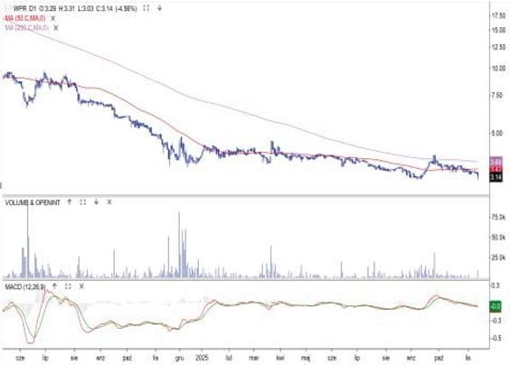 Spadające przychody i rosnące straty informatycznej spółki mają swoje odzwierciedlenie w zachowaniu notowań akcji. Kurs jest w układzie bessy. Tegoroczna baza tworzona wzdłuż średniej 50-sesyjnej została w lipcu opuszczona dołem, a w minionym tygodniu cena dotarła do historycznego minimum, wyznaczonego we wrześniu. W piątkowe po południe kurs sięgał bowiem 3,03 zł. Presja podaży nie ustaje. Wzrosło ryzyko pogłębienia dołka i kontynuacji głównego trendu. Strefa między średnimi z 50 i 200 sesji (3,4-3,7 zł), stanowi najbliższy obszar oporów.