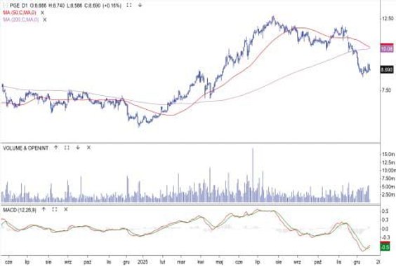 Od końca lipca akcje energetycznego giganta potaniały o blisko 33 proc. Skala strat jest tak duża, że średnia z 50 sesji wyraźnie zbliżyła się od góry do 200-sesyjnej. W piątek rano obie linie dzieliło 10 gr. Formacja krzyża śmierci jest więc nieunikniona. Taki układ średnich nie przesądza o długoterminowej perspektywie, ale wpisuje się w rosnące ryzyko bessy. Skala strat i zejście poniżej średniej z 200 sesji oznacza, że dwa warunki rynku niedźwiedzia zostały już spełnione. Do tego dochodzą źle przyjęte przez rynek informacje, że w związku z zatwierdzonymi przez URE taryfami, spółka może ponieść stratę 560 mln zł.