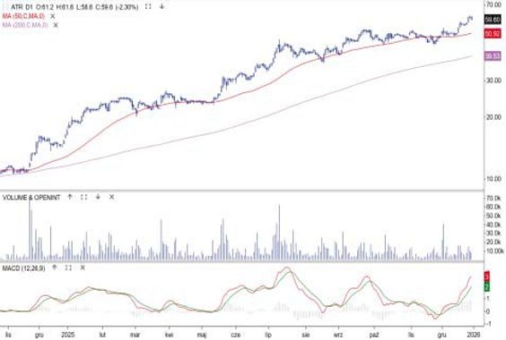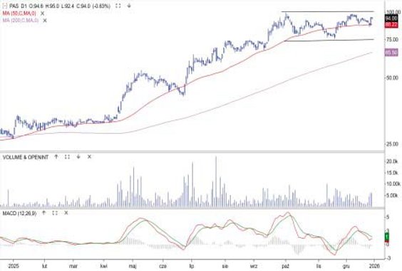 Spółka specjalizująca się w cyberbezpieczeństwie i monitorowaniu sieci to numer dwa pod względem stopy zwrotu za 2025 r. Wyniosła ona 257 proc. Większość zwyżek przypadła na II i III kwartał, co wiązało się z poprawą wyników, podtrzymaniem polityki dywidendowej (min. 25 proc. zysku) i zapowiedzią kolejnych kontraktów. W IV kwartale notowania utknęły w konsolidacji pod poziomem 100 zł. Stanowi on najbliższy opór. W jego przebiciu pomóc mogą komunikowane ostatnio nowe zamówienia (m.in. od instytucji należących do Skarbu Państwa). Najbliższe wsparcia wyznaczają średnia z 50 sesji (88 zł) i dolna granica wspomnianej konsolidacji (75 zł).
