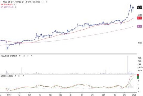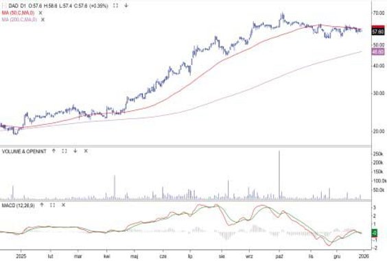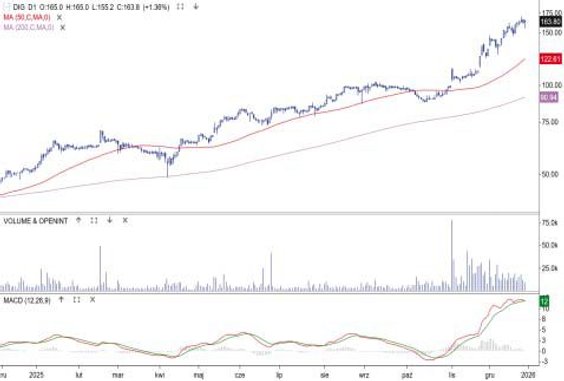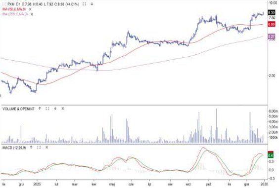 Kurs akcji budowlanej spółki wzrósł w 2025 r. o 292 proc. To najwyższa stopa zwrotu spośród niegroszowych spółek z GPW. Cena akcji poruszała się w trendzie wzrostowym, a wszystkie korekty zatrzymywały się w strefie między średnimi z 50 i 200 sesji. Notowania napędzała poprawa wyników i rosnący portfel zamówień (na koniec III kwartału jego wartość wynosiła 7,87 mld zł, a przychody po trzech kwartałach sięgały blisko 3 mld zł). Spółka zakończyła rok nowym szczytem hossy 8,4 zł. Ostatnia rekomendacja, od DM Trigon z 5 grudnia, ma cenę docelową 8,5 zł. Najbliższy techniczny opór to 10 zł, a wsparcie 6,7 zł (średnia z 50 sesji).