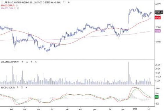 Odzieżowy gigant pokazał w środę wstępne wyniki za IV kwartał roku obrotowego 2025 r. W ostatnim kwartale przychody wzrosły rok do roku o 18 proc., a sprzedaż w salonach w ujęciu porównywalnym spadła o 0,5 proc. W całym roku obrotowym dynamiki te wyniosły odpowiednio +21 proc. i +2,3 proc. Spółka we wszystkich markach otworzyła 1029 salonów, czyli o 55 proc. więcej r/r. Rynek przyjął raport pozytywnie. Na słabej czwartkowej sesji, akcje LPP podrożały o 1 proc. i spółka była liderem WIG20. Cena akcji wróciła nad 20 000 zł, a na MACD pojawił się sygnał zwrotu. Najbliższy opór to szczyt 21 800 zł. Wsparciem jest strefa 20 000 – 19 000 zł.