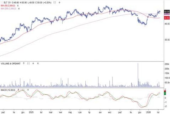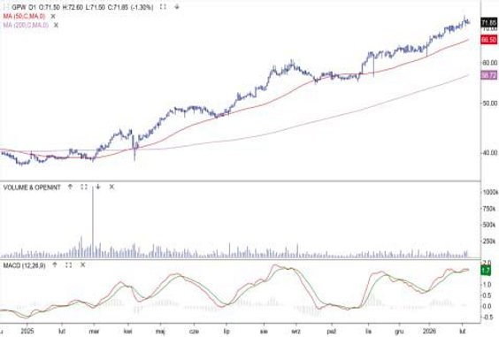 Kurs akcji warszawskiej giełdy porusza się w długoterminowym trendzie wzrostowym, a dotychczasowe korekty były skutecznie zatrzymywane w rejonie średniej z 50 sesji. Spółka wykazuje ostatnio relatywną siłę - w czwartek jako jedyna w mWIG40 była na plusie. Zwyżkom sprzyjają trwająca hossa, rosnące obroty i informacje o rosnącej świadomości inwestycyjnej wśród Polaków. Mowa tu o ostatnich, rekordowych danych o napływach do polskich ETF-ów, a także – jak pisaliśmy w Parkiecie – o rekordowej liczbie otwarć kont IKE i IKZE w 2025 r. Najbliższy opór to szczyt hossy 73,95 zł. Wsparciem jest wspomniana średnia (obecnie 66,5 zł).