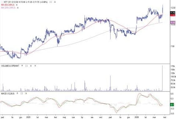 W czwartek akcje odzieżowego giganta podrożały o 12,7 proc. i w trakcie sesji cena ustanowiła maksimum wszech czasów 22 650 zł. Notowania napędzał raport wynikowy. Rok 2025 spółka zamknęła rekordowymi przychodami na poziomie 23,1 mld zł, a także zyskiem netto bliskim 1,5 mld zł. Na rok obrotowy 2026 spółka zakłada przychody w przedziale 28-29 mld zł i planuje otwarcie około 1000 nowych salonów. Ponadto zarząd podwyższył rekomendację dywidendy z 800 na 900 zł. Kurs akcji wrócił na ścieżkę hossy. Najbliższym wsparciem jest teraz strefa ostatnich oporów – 21 500 – 20 000 zł.