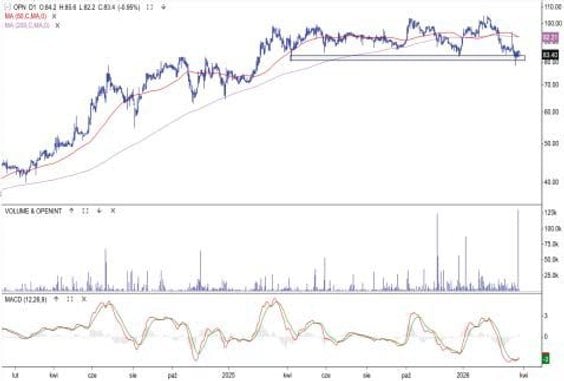 Kurs akcji dystrybutora opon i felg od roku porusza się w konsolidacji. Jej dolna granica to strefa 83-80 zł. W minionym tygodninu kurs testował te bariery. Do piątku byki korzystały ze wsparcia. Na oscylatorach MACD i RSI widać sygnały zwrotu. Zakłądając zatem kontynuację cykliczności, wzrosły szanse na falę wzrostową i ruch do górnej strefy granicznej 100-105 zł. Jeśli jednak dojdzie do przełamania 80 zł, analiza techniczna sugeruje potencjalny zasięga spadku równy szerokości konsolidacji, czyli nawet 25 zł. Istotne dla spółki będą kondycja Dadelo oraz wyniki publikoawne 21 kwietnia.