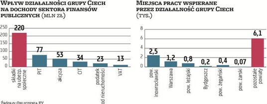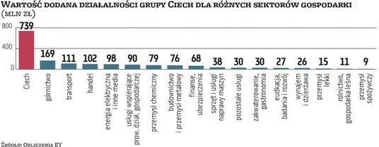Spośród ośmiu zakładów produkcyjnych, które posiada Ciech, sześć zlokalizowanych jest w Polsce. Jak policzył EY, tylko w 2018 r. wypracowały one 1,7 mld zł wartości dodanej w polskiej gospodarce, rozumianej jako wkład do PKB. Jak wynika z raportu, chemiczna grupa ma też niebagatelny wpływ na rynek pracy. W 2018 r. zatrudniała w Polsce 3 tys. osób, a każdy etat przekładał się na kolejne 2,7 miejsca pracy w pozostałych obszarach gospodarki. W sumie więc działalność Ciechu wygenerowała dodatkowo ponad 8 tys. miejsc pracy w innych firmach, głównie z sektora górniczego, transportowego i handlowego. W tym samym czasie największy krajowy producent sody wypracował blisko 420 mln zł dochodów dla sektora finansów publicznych, m.in. w postaci podatków czy składek na ubezpieczenie społeczne.