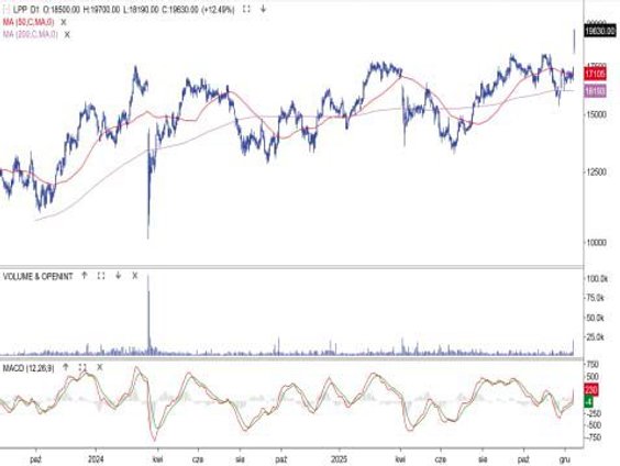 Ponadto LPP jest ostatnio ulubieńcem brokerów. W opublikowanych jak dotąd strategiach inwestycyjnych pięciu biur, LPP jest na każdej liście Top picks na 2026 r. Piątkowe wybicie kursu akcji zwiększa techniczne szanse na kontynuację zwyżek w średnim terminie. Poziom 18 300 zł stanowi obecnie najbliższe wsparcie.