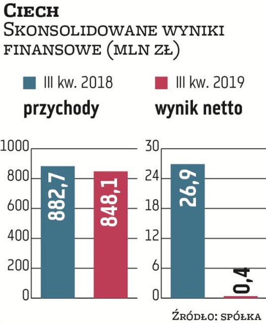 W tym czasie Ciech zanotował 848,1 mln zł skonsolidowanych przychodów i 0,4 mln zł czystego zarobku. Oba wyniki spadły odpowiednio o 3,9 i 98,5 proc. Gorsze przychody to przede wszystkim efekt działań podejmowanych w Rumunii. Najpierw w tamtejszym zakładzie spółka musiała zmniejszyć produkcję sody, a potem całkowicie ją wstrzymać. Powodem był brak dostaw pary technologicznej przez jedynego dostępnego w pobliżu zakładu producenta po akceptowalnych przez spółkę cenach. Zatrzymanie produkcji w Rumunii wiązało się też z koniecznością utworzenia odpisu z tytułu utraty wartości tamtejszego zakładu na kwotę 36,8 mln zł. To miało negatywny wpływ na zyski, podobnie jak koszt nieodliczonego podatku VAT (11,5 mln zł).