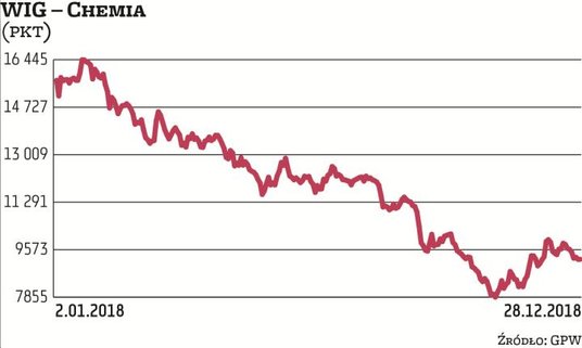 Notowania wszystkich firm chemicznych z warszawskiej giełdy w minionym roku znajdowały się pod ogromną presją. Dotyczyło to zresztą także firm z branży notowanych na innych europejskich giełdach. Jak podkreślają analitycy, w drugiej połowie 2018 r. za spadek kursów odpowiadały głównie rosnące ceny surowców, w tym gazu i węgla, a także drożejące energia elektryczna i uprawnienia do emisji CO2. Negatywne przełożenie na notowania firm z branży miały także obawy inwestorów o perspektywy wzrostu w Azji po nałożeniu taryf na Chiny przez USA, słabsze dane płynące z branży motoryzacyjnej, jak również niskie poziomy rzek w Niemczech. Od początku stycznia do końca grudnia 2018 r. notowania polskiego indeksu WIG-chemia stopniały w sumie o 40 proc. Dopiero pod koniec roku widoczne było odbicie kursu. Potężne tąpnięcie zaliczyła Grupa Azoty i jej spółki zależne, co związane było z dużą niepewnością co do przyszłości branży nawozowej. W całym 2018 r. kurs tarnowskich Azotów spadł o 55 proc. Akcje zależnych Puław potaniały w tym czasie o 57 proc., a Polic o 35 proc. W dół skoczyły także notowania Ciechu, które obniżyły się w ciągu roku o 23 proc. W tym samym czasie kurs PCC Rokita stopniał o 21 proc., a Polwaksu – o 37 proc.
