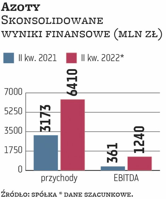 Wysokie ceny surowców i problemy z ich dostępnością oraz inne zawirowania związane z agresją Rosji na Ukrainę nie wywierają negatywnego wpływu na wyniki Azotów. Jest wręcz przeciwnie, o czym zdają się świadczyć szacunkowe dane opublikowane za II kwartał. W tym czasie grupa wypracowała 6,41 mld zł przychodów, 1,24 mld zł EBITDA i 0,8 mld zł zysku netto. W ujęciu rok do roku wzrosły one odpowiednio o 102 proc., 243,2 proc. oraz 459,1 proc. To przede wszystkim następstwo szybciej rosnących cen wszystkich oferowanych produktów niż kosztów ponoszonych na ich wytworzenie. Wzrosty byłyby jeszcze większe, gdyby nie wolumenowy spadek łącznej sprzedaży.