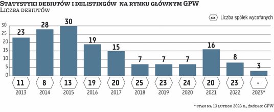 Oferta przejmującego jest zbliżona do średniej ceny docelowej z ostatnich rekomendacji, ale analitycy, z którymi rozmawialiśmy, sygnalizują, że Ciech jest w ciekawym momencie – spadek cen surowców przy względnie stabilnych cenach produktów daje szanse na dobre wyniki za I półrocze 2023 r., a one jeszcze nie są w rekomendacjach zdyskontowane. Niewykluczone więc, że obecna oferta Kulczyka okaże się niewystarczająca dla inwestorów mniejszościowych. Jeśli Ciech zniknie z GPW, to zasili statystyki delistingów, które i tak są już niepokojące. Prawie 190 spółek wycofano z rynku w ostatniej dekadzie – wynika z szacunków „Parkietu”. W tym czasie debiutów było 160. Dane wyglądają jeszcze gorzej, jeśli nie będziemy uwzględniać firm z NewConnect. „Prawdziwych” debiutów w 2023 r. jeszcze nie było. W całym 2022 r. też nie. W sumie w ostatniej dekadzie było ich niespełna 100. Prawie o połowę mniej niż firm wycofanych.