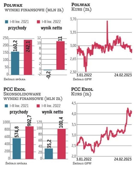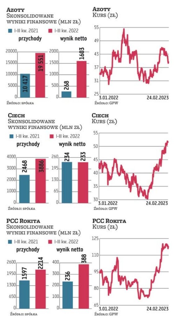 Jakub Szkopek, analityk Erste Securities Polska, zauważa, że w polskiej i europejskiej branży chemicznej jest dziś lepiej, niż można było oczekiwać. – Spadające ceny gazu ziemnego i węgla powodują, że wiele firm ponosi niższe koszty niż jeszcze kilka miesięcy temu i w efekcie zwiększa produkcję. Odbiorcy produktów chemicznych, tacy jak przedsiębiorstwa ceramiczne i huty szkła, zyskują nawet podwójnie, bo z jednej strony otrzymują nieco tańsze półprodukty chemiczne – właśnie z powodu spadku cen gazu i węgla – a z drugiej bezpośrednio korzystają ze zniżek cen tych surowców, gdyż często dużo ich zużywają na własne potrzeby – twierdzi Szkopek. Z tej sytuacji korzystają zwłaszcza Ciech i PCC Rokita.