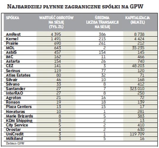 Najbardziej płynne firmy zagraniczne na GPW przyniosły zróżnicowane roczne stopy zwrotu. Dobrze wypadły m.in. MOL, IMC czy Kernel, bardzo słabo zaś Astarta czy Serinus. – Inwestowanie w spółki zagraniczne wiąże się z dodatkowymi ryzykami. Najważniejszym z nich wydaje się działanie w innej jurysdykcji. Jeśli dominująca część biznesu znajduje się poza Polską, to zmiana przepisów lokalnych może istotnie wpłynąć na działalność spółki i nie zostać tak łatwo wychwycona przez polskich inwestorów. Dodatkowo firmy zagraniczne raportują w innej walucie niż złoty – mówi Mateusz Namysł, analityk mBanku.