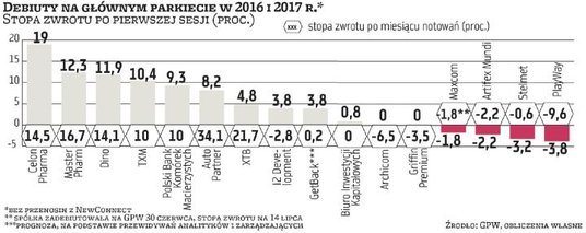 Za udanym startem GetBacku na GPW przemawia także historia. Spośród 16 spółek, które przeprowadziły IPO w 2016 i 2017 r. (pominięte zostały przenosiny z NewConnect), debiutancką sesję na minusie kończyły jedynie cztery firmy. Najlepszą inwestycją w IPO okazały się w tym czasie akcje Celon Pharmy. Jej walory na zamknięciu pierwszej sesji były o 19 proc. droższe niż w ofercie publicznej.