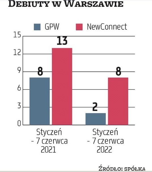 Widać też, że światowy trend dotyczący spadku liczby debiutów na giełdach dotarł także do Warszawy. Od początku roku na NewConnect zadebiutowało osiem spółek. W analogicznym okresie rok wcześniej było ich 13. Z kolei na GPW doszło do dwóch debiutów, jednak oba polegały na przenosinach z małej giełdy. Z kolei rok wcześniej było osiem debiutów, z czego trzy firmy przeszły z NewConnect.
