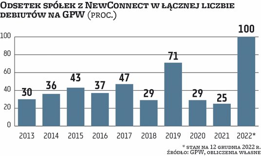 Oprócz Cloud Technologies rynek notowań w tym roku zmieniły również BioMaxima, Spyrosoft, Creotech Instruments, SimFabric, Bioceltix, Caspar Asset Management oraz TenderHut. Tylko jedna firma zrealizowała przy okazji przeprowadzki emisję – Creotech. Pozyskał prawie 40 mln zł. I właśnie ta kwota odpowiada za całą wartość tegorocznych IPO – wobec kilku miliardów złotych w minionym roku. Przed covidowym ożywieniem wartości IPO były niższe. Natomiast pod względem liczby IPO najsłabsze były lata 2018, 2019 i 2020 – z zaledwie siedmioma debiutami.