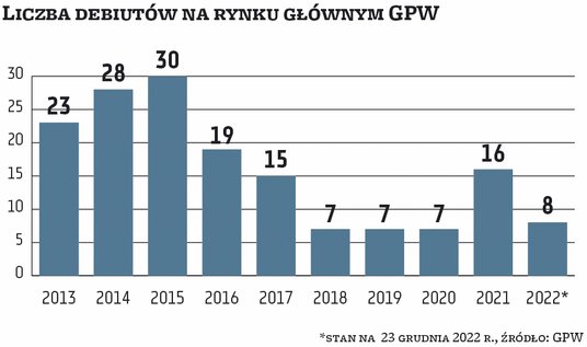 – Tak wymagające otoczenie nie sprzyjało przeprowadzaniu transakcji IPO, gdyż z jednej strony spadające wyceny zniechęcały emitentów i ich akcjonariuszy do debiutów giełdowych, a z drugiej odpływy z funduszy inwestycyjnych ograniczały dostępność kapitału i powodowały, że inwestorzy często woleli skupić się na zarządzaniu już posiadanymi pozycjami, aniżeli podejmowaniu ryzyka wejścia w nową spółkę – komentuje Arkadiusz Bociąga, dyrektor w departamencie rynków kapitałowych Santander BM. Liczy, że rok 2023 będzie istotnie lepszy pod kątem aktywności transakcyjnej. – Przede wszystkim spodziewam się kolejnych transakcji na już notowanych spółkach, ale wierzymy, że GPW zostanie też wzbogacona o kilku nowych emitentów – mówi. Wtóruje mu Bartosz Kędzia, dyrektor w biurze maklerskim mBanku. Informuje, że na początku 2022 r. jego biuro miało w przygotowaniu co najmniej kilka transakcji IPO i rok ten zapowiadał się równie interesująco, jak rekordowy 2021. Niestety, z uwagi na wybuch wojny w Ukrainie rynek nagle się zamknął, a emitenci i sprzedający musieli podejmować decyzje o zawieszeniu transakcji lub pozyskaniu finansowania z innych źródeł. Jego zdaniem rok 2023 przyniesie ożywienie na rynku IPO, jednak niekoniecznie już w pierwszej półroczu.