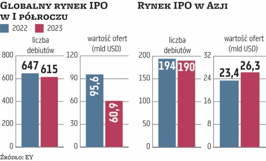 W II kw. 2023 r. liczba transakcji na świecie spadła r./r. o 3,4 proc. (z 321 do 310), a wpływy z nich o 4,6 proc. (z 40,9 mld dol. do 39 mld dol.). Jeszcze gorzej wyglądają statystyki za I półrocze. Liczba debiutów spadła o 5 proc. (z 647 do 615), a wartość transakcji zanotowała aż 36,3-proc. spadek (z 95,6 mld dol. do 60,9 mld dol.) – wynika z danych EY.