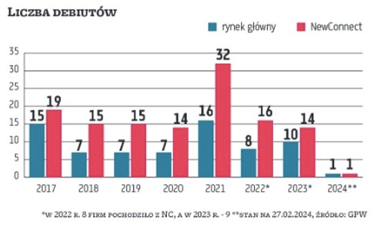 Za nami niemal dwa miesiące 2024 r., a na GPW zadebiutowała tylko jedna spółka – Bloober Team, który przeniósł się z NewConnect. Obecnie nie ma nadziei na nowego (spoza NewConnect) debiutanta. Postępowania w sprawie zatwierdzenia prospektów emisyjnych siedmiu spółek są zawieszone. To ExpertSender, Event Horizon, Transition Technologies MS, Desa, Oferteo, Metalkas i Emitel.