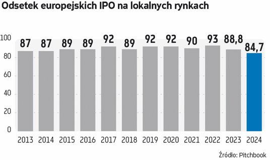Te czynniki mają odzwierciedlenie w analizie Pitchbooka, z której wynika że w zeszłym roku odsetek europejskich spółek notowanych na swoich krajowych giełdach spadł do najniższego poziomu od dekady. Ponad 15 proc. ze wszystkich 183 IPO europejskich spółek odbyło się na innych giełdach. Średnio w ostatniej dekadzie odsetek ten sięgał 10 proc. Podobnie jak mediana.