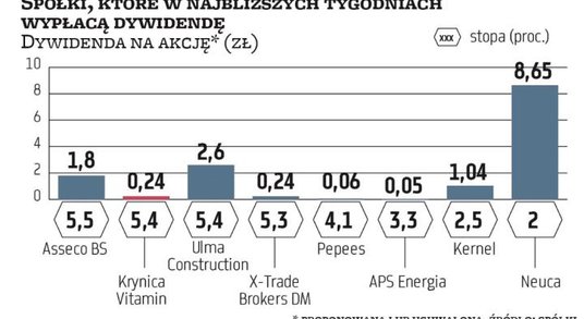 Wysoką, ponad 5-proc. stopę w tym roku zaoferują również spółki, takie jak Krynica Vitamin, Ulma Construction czy X-Trade Brokers DM. Walne zgromadzenie akcjonariuszy tej pierwszej spółki zbierze się 27 kwietnia. Jej zarząd rekomenduje, aby wypłaciła ponad 2,9 mln zł, czyli 0,24 zł na akcję (wobec 0,66 zł rok temu). Pozostała część zysku w kwocie 4,56 mln zł miałaby trafić na kapitał zapasowy. Proponowany dzień dywidendy to 2 maja, a wypłata miałaby nastąpić 14 maja.