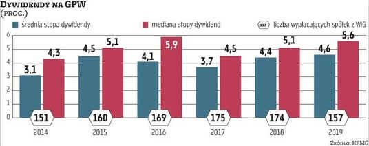 – Co ciekawe, w kontrze do mniejszej liczby spółek dywidendowych była wysokość stopy dywidendy, która rosła od 2017 r. W 2019 r. mediana stopy dywidendy dla spółek z WIG wyniosła około 4,6 proc., a łącznie spółki wypłaciły około 23,8 mld zł, czyli o około 3 mld zł więcej niż w roku poprzedzającym – wylicza Roman Lisiecki, wicedyrektor w zespole wycen w KPMG w Polsce.