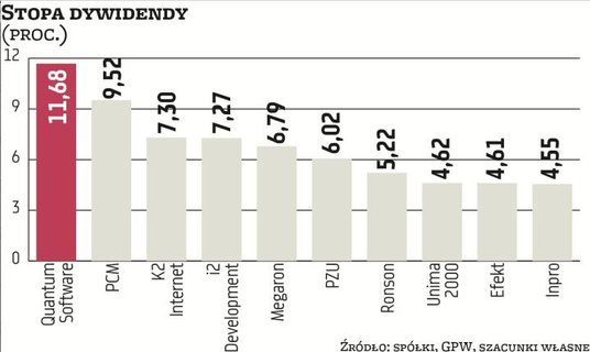Natomiast zdecydowanie hojniejsze są Inpro i Quantum Software. Ta pierwsza oferuje 4,8-proc. wskaźnik, a druga ponad 11-proc. Dzień wypłaty ustalono u nich na 30 sierpnia. Uchwalenie imponującej dywidendy w informatycznym Qauntum w ostatnich tygodniach windowało notowania. W sumie do akcjonariuszy trafi ponad 2,9 mln zł, co daje 2,22 zł na akcję. Rok wcześniej było to 1,46 zł. Dywidendowym pewniakiem w branży IT jest grupa Asseco, która również w tym roku hojnie podzieliła się zyskiem.