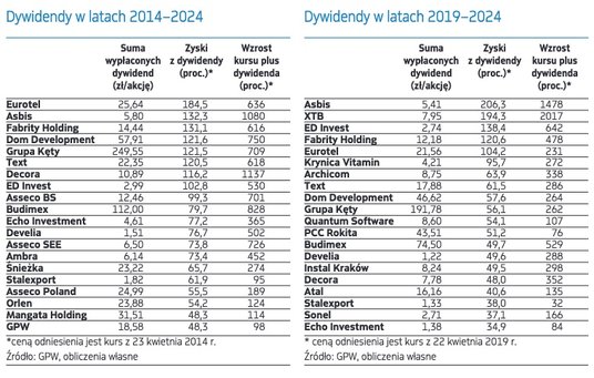 W okresie ostatnich dziesięciu lat w przypadku ośmiu spółek zysk z dywidendy przekroczył wartość zainwestowanej kwoty wydanej na zakup akcji. Ponadprzeciętnie wysoki zarobek z regularnych wypłat z zysku zapewniły akcje Eurotelu, gdzie stopa zwrotu przekroczyła 180 proc. w omawianym okresie. Spółka ta nieprzypadkowo znalazła się tak wysoko. W ostatnich latach nie tylko regularnie dzieliła się zyskiem (tylko w 2020 r. miała przerwę), ale z roku na rok kwota wypłat była zwiększana, osiągając 10,95 zł na akcję w 2023 r. W tym roku jednak akcjonariusze muszą poskromić swoje apetyty, w ślad za wyraźnie niższymi rok do roku zyskami w dół pójdzie dywidenda, która według propozycji zarządu wyniesie tylko 4 zł na walor.