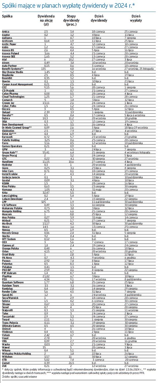 Ponadprzeciętnym wskaźnikiem dywidendy wyróżnia się Dębica, która skłania się ku wypłacie 10,30 zł na jeden walor, co przy obecnym kursie daje stopę wynosząca ponad 11 proc. Co ciekawe, zdaniem mniejszościowych akcjonariuszy, którzy zgłaszają zastrzeżenia do działań zarządu w kwestii m.in. polityki wypłaty dywidendy w ostatnich latach, kwota proponowana na jej wypłatę powinna być wyższa niż tylko połowa zeszłorocznego zysku. Dlatego domagają się m.in. przedstawienia przez zarząd uzasadnienia dla przeznaczenia części zysku na kapitał rezerwowy na zgromadzeniu zaplanowanym na 27 czerwca. Ostatnie słowo w kwestii wysokości dywidendy będzie należeć jednak do głównego akcjonariusza – Goodyear – który posiada ponad 87 proc. głosów.
